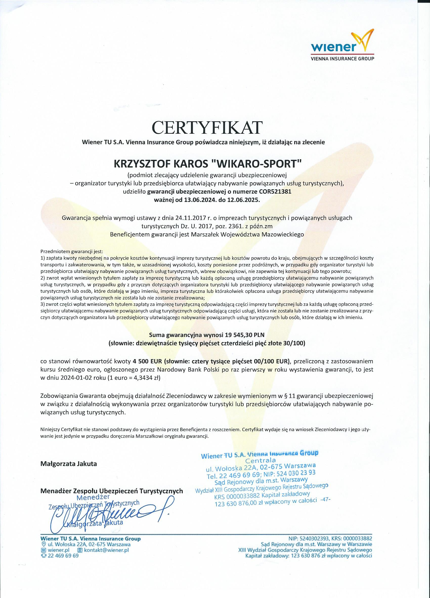 WiKARO-SPORT posiada Zaświadczenie o wpisie Rejestru Organizatorów Turystyki i Pośredników Turystycznych Województwa Mazowieckiego nr 765 oraz Ubezpieczenie Organizatora Turystyki w UNIQA Towarzystwie Ubezpieczeń S.A. i jest odpowiedzialne za organizację imprezy oraz współpracę z kontrahentami. - Niniejsze warunki uczestnictwa w imprezach organizowanych przez WiKARO-SPORT określają w nich udział Klientów i stanowią integralną część umowy wyjazdu.